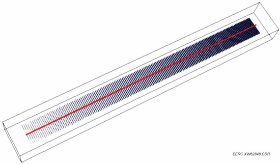 The goal of this study was to illustrate a workflow for applying the NN–MCMC approach and the EDFM method to characterize the matrix and fracture network properties and not to match production for all 11 HFTS-1-Midland wells. Thus, a single-well reservoir simulation model for Well 7SU was built using the reservoir parameters, the EOS model, and fractures created using EDFM. Figure 6 shows an oblique view of the reservoir simulation model with horizontal wellbore and hydraulic fractures, and Table 2 shows the basic reservoir, wellbore, and fracturing data for the simulated Well 7SU. Natural fractures were not simulated in this study because of a lack of available data and observations by other HFTS-1-Midland researchers that natural fractures minimally contribute to the fracture network fluid flow as compared to hydraulic fractures [25]. The grid size of the model was 41 ft in both X- and Y-directions. The grid size varied from 26.4 to 118.7 ft/cell in the Z-direction to represent the different thicknesses of layers in the vertical direction. The purpose was to refine the region containing Well 7SU and its hydraulic fractures so the fracture–matrix and matrix–matrix flow calculations could be more accurate. The number of grids in the X-, Y-, and Z-directions was 274, 34, and 16, respectively. The length (in the Y-direction), width (in the X-direction), and height (in the Z-direction) of the model were 11,234 ft, 1394 ft, and 802 ft, respectively. An additional four grids were added to the X-direction to represent non-neighboring hydraulic fractures. The added grids were only used for flow calculation without impacting the material balance in the model.