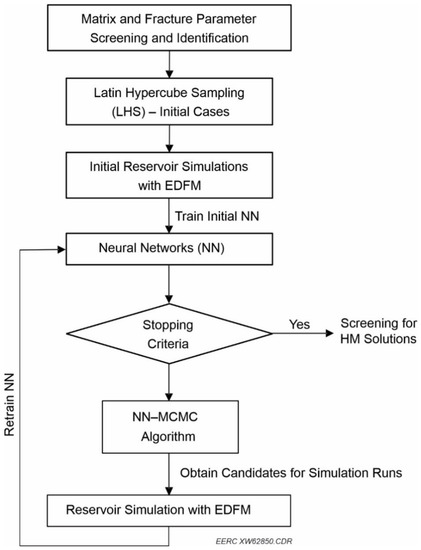 Initial cases that covered the input ranges of the uncertainty parameters were generated by Latin hypercube sampling (LHS) [46]. Fracture models were generated by EDFM and then integrated into simulation models for these initial cases, which were executed to generate simulation results. In the first iteration, the inputs and results of the initial simulation cases were extracted to train an initial set of neural networks (NNs). Next, the NN–MCMC algorithm [42] was run to perform HM automatically and select acceptable HM solutions. The obtained simulation inputs and results were then used to retrain the NN in the second iteration. The workflow would stop if no significant improvement was detected in the latest iteration (stopping criteria); otherwise, the workflow would continue until the maximum number of iterations was reached.