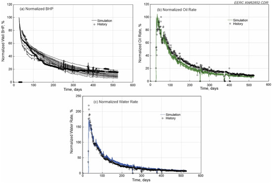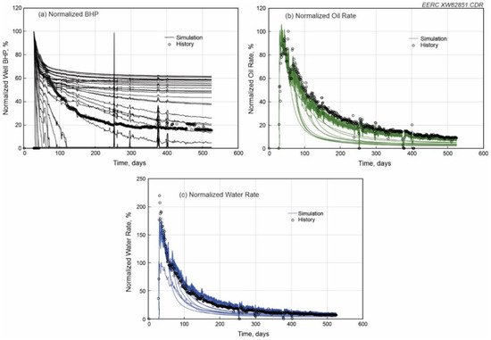 Initial simulation results and historical data for Well 7SU for (a) normalized BHP, (b) normalized oil rate, and (c) normalized water rate. (a) shows that three simulated BHP curves were close to field data. (b,c) show that 31 simulated oil and water rate curves were reasonably matched with the field data.