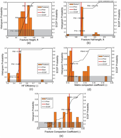 The best case for Scenario 1 was observed from the combination of fracture half-length, fracture height, HF efficiency, matrix compaction coefficient, and fracture compaction coefficient of 189.36 ft, 109.67 ft, 0.481, 0.11, and 0.038 respectively, as illustrated by the red vertical line in Figure 11. The prior and posterior distributions of the input parameters for Scenarios 2–13 can be found in Figure A1, Figure A2, Figure A3, Figure A4, Figure A5, Figure A6, Figure A7, Figure A8, Figure A9, Figure A10, Figure A11 and Figure A12 in Appendix A.
