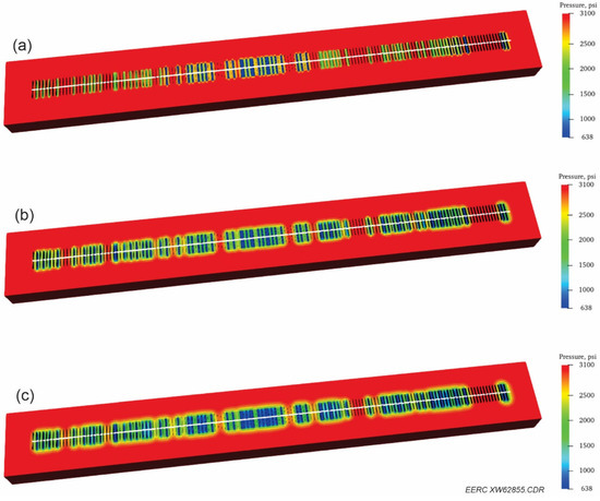 Comparing Figure 3a,b, the MPIs among the Upper Wolfcamp wells decreased from the first to second pressure interference test (PIT), while the change in MPIs among the Middle Wolfcamp wells was not significant. The results imply that the fractures connecting the Upper Wolfcamp wells were closing from the first to second PIT, while the fracture closure effect was not significant for the Middle Wolfcamp wells from the first to 2 s PIT. The PIT results also show that the pressure interference from other wells to Well 7SU is the smallest because no arrow points to Well 7SU. Despite the pressure data for Wells 8SU and 8SM being lost for the second PIT, the information provided in Figure 3a and the fracture closure effect together imply that the pressure interference from other wells to Well 7SU during the second PIT was not significant.