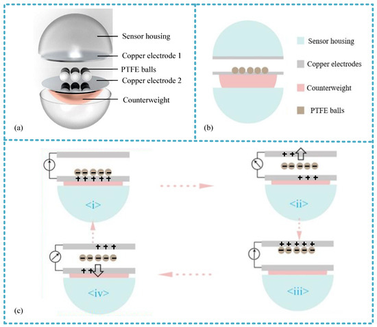 The main body of the annulus-like curved deformable sensor (RSV−TENG) consists of an internal spherical vibration sensor. As shown in Figure 1a, the internal vibration sensor is composed of a casing, copper electrodes, PTFE balls, and a counterweight. The structure of the whole sensor is spherical, consisting of a shell, two copper electrodes, Teflon balls, and a counterweight. We used the 3D printing process to produce the acrylic board. Each spherical shell is divided into two parts. An acrylic plate is installed inside the two spherical shells. The upper acrylic adhering section is copper electrode 1, the face of positive, and the bottom acrylic adhering section is copper electrode 2, the same size as copper electrode 1, and the face of negative. The PTFE balls are placed between the two copper electrodes. The counterweight is placed under copper electrode 2 in the lower shell to ensure the directionality and stability of the sensor. Finally, the current is led out through wires and connected to the electrometer to form a loop. The sensor housing is constructed of PMMA with a diameter of 50 mm, the diameter of each copper electrode is 43 mm with a thickness is 0.05 mm, and the diameter of each inner PTFE ball is 5 mm. During the subsequent tests, we placed 10 PTFE balls inside the sensor. The bottom counterweight is a steel ball with a diameter of 10 mm and a counterweight of 10 g.