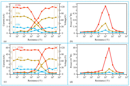 The power-generation performance of RSV−TENG was studied with resistors of different resistance values. When there was only one vibration sensor inside RSV−TENG, it can be seen from Figure 5a that the voltage value of the sensor increased with the increase in vibration frequency and external resistance, and the growth area was divided into three stages. In the first stage, the resistance value was from 0 to 5.5 × 104 Ω, and the output voltage of a single sensor was always low, approaching 0. When the resistance value is from 5.5 × 104 to 107 Ω, the voltage was in the rising stage, and the output voltage of RSV−TENG in this stage had a linear positive correlation with the resistance value. In the third stage, the resistance value was from 107 to 109 Ω, and the voltage of each frequency in this stage tended to be stable and reached the highest value. At the same time, it could be seen from Figure 5 that when the vibration amplitude was 12 Hz, the voltage increase slope was more than 9 Hz and the voltage increase slope was more than 4 Hz. The output of the current under different resistance values was also measured, and the output could also be divided into three stages. In the first stage, when the output current was from 0 to 5.5 × 104 Ω, the output current remained stable and there was no obvious difference. The output value was the highest of the three stages; meanwhile, the rate of change increased with the increase in frequency.