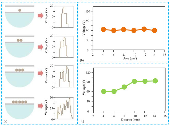 Influence of the internal structure on the output performance of the sensor. (a) Effect of the number of PTFE balls on the output voltage and waveform; (b) effect of the area of the copper electrode on the output performance of the sensor; and (c) effect of the distance of the copper electrode on the output performance.