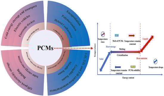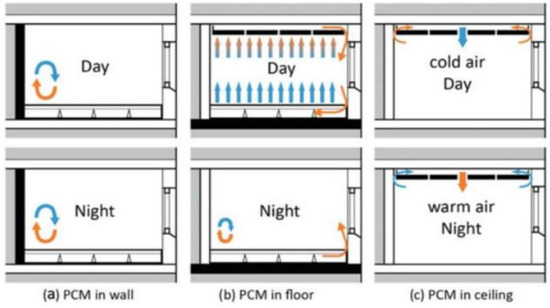 Figure 13 explains the fundamental notion of temperature regulation using PCMs incorporated into the building structure [160]. As observed, surplus heat from the room may be retained in the PCM to maintain a lower room temperature during the day’s high temperatures. During low-temperature periods of the day, such as at night or in the morning, stored heat might be removed by active or passive heat exchange. Furthermore, microencapsulated PCM is commonly used in wallboards, whereas macroencapsulated PCM is mostly used in ceiling boards and flooring.