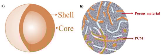 Architectures of (a) a capsule of core-shell encapsulated PCM and (b) shape-stabilized PCMs are depicted.
