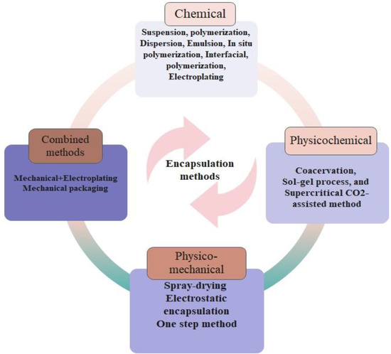 Encapsulation based physical-chemical methods includes two techniques, which are coacervation and sol–gel encapsulation [35]. Coacervation usually involves the use of two or more colloids [36]. The coacervation technique is based on the phase separation from the initial solutions and subsequently forms a new coacervate phase; then the material is coated by coacervate to finally obtain core material surrounded by a shell [37]. Shanshan Tie et al. [38] developed a simple technique based on self-crosslinking between core and wall materials in the coacervation system for effective procyanidin encapsulation (PCs). The coacervates were created by interacting bioactive PCs, gelatin, and sodium alginate, then forming a sodium alginate-calcium ion cationic bridge to increase the PCs’ stability. This indicates that PCs have a greater protective effect after being encased in coacervates. Another work by Bayés-García et al. [39] consists of using two coacervates agar-agar/acacia gum and sterilized gelatin/acacia gum as shell compositions in the manufacture of PW-based microcapsules using a sophisticated coacervation technique.