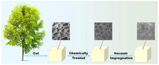 In contrast to the previous method, the interfacial polymerization method happens at the oil–water interface under the action of an initiator when two reactive monomers are dissolved independently in the oil and water phases. The general steps of interfacial polymerization are as follows: (1) the formation of an O/W emulsion containing PCMs and a hydrophobic monomer; (2) the addition of the hydrophilic monomer to initiate the polymerization under appropriate conditions; and (3) the formation of microcapsules via filtering, washing, and drying. Jian Shi et al. [30] elaborated on this idea to create PCM-based paraffin@ polymethyl methacrylate (PCM@PMMA) nanocapsules, which are characterized as promising for energy storage applications. In another study, Xin Yang et al. [31] created a new lauric acid (LA) microcapsule with a silica (SiO2) shell using interfacial polymerization. The obtained material is found to be a good candidate for energy storage applications. Liu et al. [32] produced a range of biobased, shape-stable composite phase change materials (SSCPCMs) consisting of chemically treated wood (CTW) as the porous supporting material and myristic acid (MA), paraffin (PW), and polyethylene glycol (PEG) as the phase change working component (Figure 5). The obtained SSCPCMs were found to be good candidates for thermal energy storage.