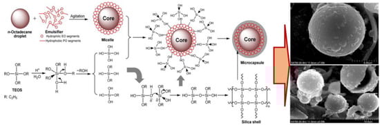 Another encapsulation method-based sol–gel used as a chemical-physical technique is used to prepare capsules at the micro or nano level. It is characterized by low processing costs and moderate processing conditions, which is the reason it should gain more attention from the scientific community. Generally, the sol–gel technique can be divided into three actions: (1) hydrolysis, (2) condensation, and (3) drying [27]. The sol–gel approach with an oil-in-water (O/W) emulsion has been used effectively to encapsulate SiO2 and other inorganic minerals. For instance, Junping Ren et al. [40] prepared four different samples of phase change composites by sol–gel encapsulation (pure PCM, silica powder-adsorbed PCM, floating bead-adsorbed PCM, and activated carbon-adsorbed PCM). As a result, the activated carbon-adsorbed PCM show higher heat storage capacity compared to other PCMs. Maria Dolores Romero-Sanchez et al. [41] used sodium nitrate, NaNO3, as a phase change material (PCM) and the microcapsulation process using the sol–gel technique, taking an inorganic compound (SiO2) as a shell material. The obtained material is convenient as a potential for thermal energy storage applications such as solar plants or recovering of waste heat in industrial processes. In a study by Zhang et al. [42], the sol-gel procedure was used to create a series of C18 microencapsulated with SiO2 shells at varied pH levels; the spherical microcapsules had a definite heart-shell configuration (Figure 6).