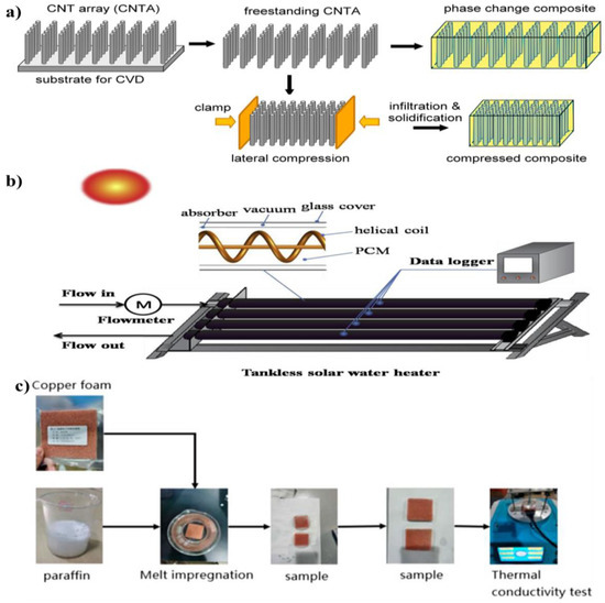 (a) CNT arrays with compressible alignment and PCC [79], (b) [80], and (c) the process of fabrication of copper foam/paraffin PPC [81]. Reproduced with permission.