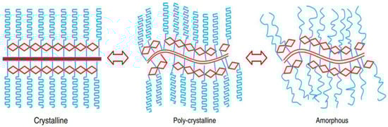 To reduce the polymeric solid–solid PCCs’ latent heat, a new “semi-interpenetrating” system topology was constructed by Zhang et al. [115]. An instance of this technique is used by Zhang et al. [116] by impregnating PW into a crosslinked PU framework using an in situ doping technique. Unlike prior research, the structure of cross-linked PU was created as a support matrix for the PWs. As a result, 210.6 J/g was obtained for the phase change enthalpy at 74 wt% PW. Another study created temperature-controlled latent thermal PCMs with a semi-interpenetrative network structure using a PU structure cross-linked with PEG [115].