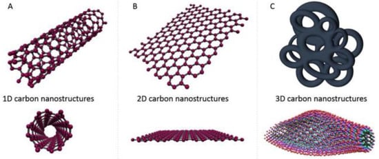 Illustration of the fundamental carbon nanostructures: (A) 1D carbon nanostructure (1D CNTs and CFs), (B) 2D nanostructure (graphene, graphite nanoplates, EG, and GO), and (C) 3D nanostructure (carbon foam, and graphite/graphene foams and aerogels) [146].