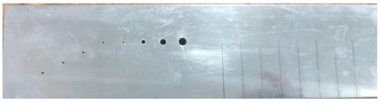 To conduct experiments in this study, a test block including artificial defects was designed, as shown in Figure 1. As the material of the test block, aluminum 2014 was selected and eight side drilled holes (SDHs), with diameters from 0.5 mm to 4 mm, as well as eight electric discharge machining (EDM) angled slots, with lengths of 1 mm and 2 mm, were fabricated on the specimen to emulate voids and cracks in the pipeline welds, respectively. The artificial defects were manufactured by electrical discharge machining (EDM) with a machining accuracy of ±0.1vmm. For the artificial defects, we used metrology verification to ensure the accuracy of defect dimensions. The coordinate system (x,z) of each image was determined by taking the bottom left vertex in Figure 1 as coordinate origin. For example, defect 1, for which the coordinate was (20, 15) was 20 mm from the left side of the block and 15 mm from the bottom, in order to label the spatial information of the defects. The defects used in the following study are listed in Table 1 below: