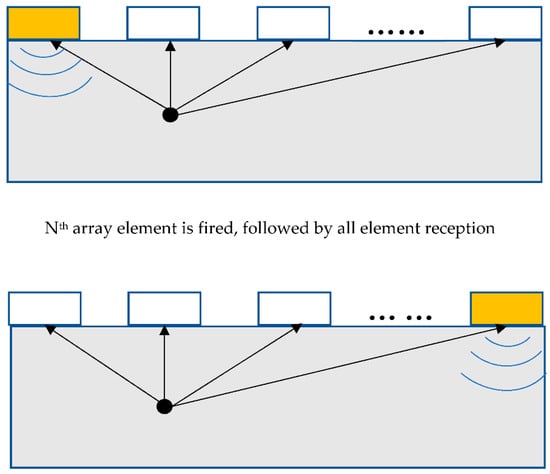 Drinkwater proposed an advanced imaging approach (known as TFM) using the so-called FMC data, whereby all the scattered signals from each transmit–receive pair are thoroughly exploited for post-processing [15]. The imaging resolution and detectability of TFM is overwhelmingly higher, relative to others [16,17]. The schematic diagram of transmission and reception in FMC is demonstrated in Figure 2 below.