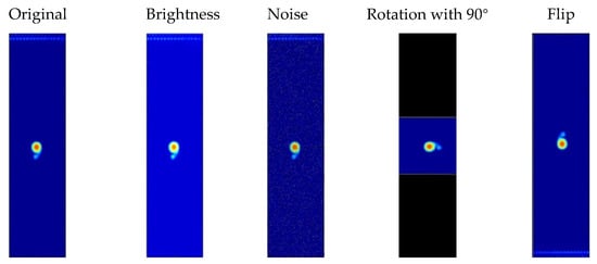 Insufficient practical samples of phased array imaging and high computational cost have led to a significant gap between effective defect classification and the use of deep learning algorithms. The data augmentation method utilizes auxiliary data sets or information to either enhance the features of samples in the target data or augment the size of target data sets, whereby the model can better extract features [20]. Prior study [21] also suggests that data enhancement might transform the original image data geometrically by changing the image pixel position with identical image features. Additionally, data enhancement methods, such as image rotation, change in image width and height, and image brightness modification [22], have been previously exploited to enlarge the plant image datasets of different defects with small samples, thereby solving the overfitting problem caused by the limited size of the dataset for machine learning. As shown in Figure 3, this study realized the novel augmentation of data sets by rotating the image, increasing noise and changing image brightness. Consequently, the augmented dataset, in which 25% of the image data was the test set and the remaining image data was the training set, is displayed in Figure 4 and Figure 5.