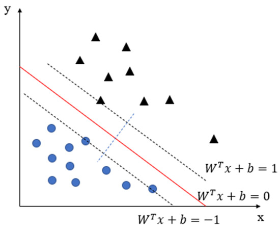SVM is a machine learning algorithm, based on statistical learning theory, which is of satisfactory learning performance in the case of small samples. As shown in the figure, SVM is a classification hyperplane that can distinguish positive samples from negative ones and maximize the interval between positive and negative samples in the high-dimensional feature space [25]. Linear SVM model is shown in Figure 7.