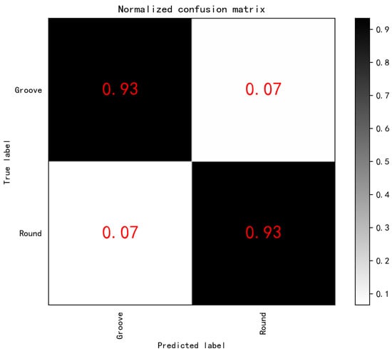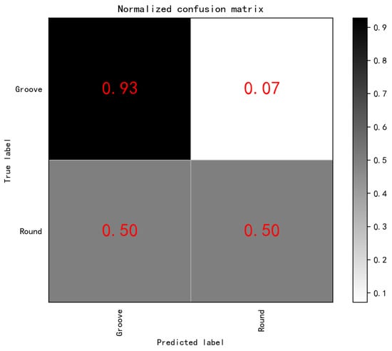Again, Hog was used to extract defect features, and the features were input into the KNN algorithm. The KNN algorithm K value in this paper was 11, that is to say, HOG-KNN was used to predict and classify SDHs and slots in TFM images, and the confusion matrix was obtained, as shown in Figure 11. The accuracy of slot defect prediction was 93%, with 7% of slot defects mispredicted to be SDH defects, and 50% of SDH defects were mispredicted to be slot defects.