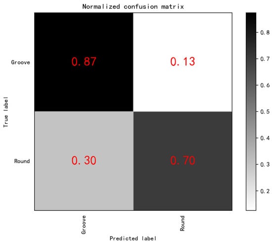 Next, Hog was used to extract defect features, and the features were input into the Cart Decision tree algorithm (i.e., the HOG-CART Decision tree was exploited to predict and classify SDH and slots in TFM image), and the confusion matrix was obtained, as shown in Figure 10. Specifically, the prediction accuracy of slots was 91% and 9% of slots were mispredicted to be SDHs. The accuracy of SDHs was 77%, and 23% of SDHs were mispredicted to be slots.