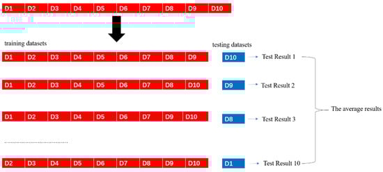 Meanwhile, for such small-sample data sets, the performance of the method using division of independent test sets was often not viable. This was because, in the case of small samples, it is necessary to select some test data which differ from the training set. Consequently, the scale of the training set becomes relatively small, leading to the problem of inadequate model training and overfitting. Ten-fold cross-validation divides the dataset into ten groups, nine of which are used as the training set and the remaining one as the test set. Each group of data is used as the test set in rotation with 10 cycles, as it is shown in Figure 15. By adopting the ten-fold cross-validation partition method, ten models, in which the evaluation results are calculated from the test set and their average value taken as the final result, are, therefore, obtained. This method can effectively use limited data to complete the training and evaluation of the machine learning algorithms, as shown schematically in Figure 16 below.
