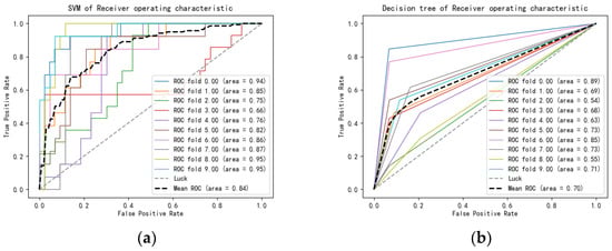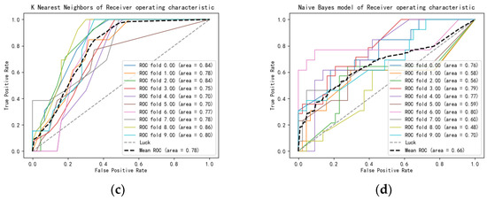 (a) SVM of Receiver operating characteristic; (b) Decision tree of Receiver operating characteristic; (c) K Nearest Neighbors of Receiver operating characteristic; (d) Naive Bayes model of Receiver characteristic.