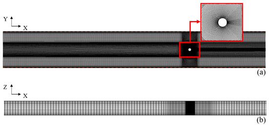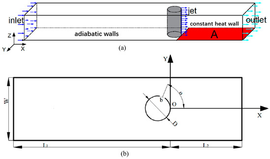 A cylinder pillar was placed in a three-dimensional, non-isothermal microchannel, and the jet issued from this pillar was used to enhance the heat transfer of the unsteady flow in the microchannel, as shown in Figure 1. The geometric model and size refer to Jung [31]. The microchannel was in length, in width, and in height, and a steady jet was injected through a narrow slit of along with the cylinder (). The model diagram is shown in Figure 1. Except that the bottom wall (A) behind the cylinder (), colored in red, was a constant heat wall, of which the temperature was kept at , the others were adiabatic walls. Meanwhile, the temperature of incoming flow was , and the injection ratio (I) is defined as the ratio between the jet velocity and the inlet velocity, according to Karthikeyan et al.’s study [30]. The jet angle () is defined as the angle between the jet slit and the positive direction of the X-axis in the study. The origin coordinate was located at the intersection point of the bottom centerline and the junction line of the heat source and the adiabatic wall, the positive direction of the X-axis was along the incoming flow direction, and the Y-axis and Z-axis were parallel to the width and height of the microchannel, respectively, as shown in Figure 1.