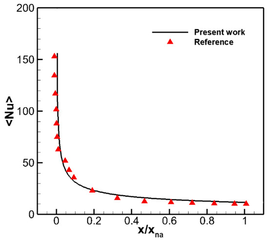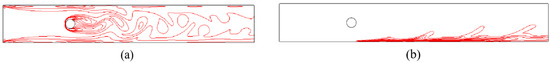 The two-dimensional, unsteady laminar flow in the non-isothermal microchannel with a circular obstacle with the blockage ratio and was investigated to verify the numerical method [15]. It was found in Figure 2a that the cylinder excited the Karman vortex street in the microchannel, but the viscosity and thermal conductivity of water were related to temperature, and the whole vorticity distribution was not symmetrical about the centerline of the microchannel. From Figure 2b, these shedding vortices had a favorable effect on the overall heat transfer. It can also be qualitatively shown in Figure 3. It shows that the numerical method used in this paper was accurate and reliable through comparison with the results of the previous work [15].