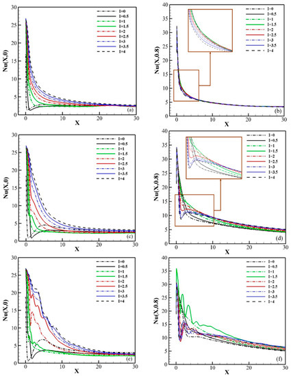 The local Nusselt numbers at , as shown in Figure 5b,d,f, were larger than those at . As , the local Nusselt number at had no obvious changes with the injection ratio. Especially when , the local Nusselt numbers almost overlap. When , it was found that the local Nusselt number fluctuated violently near at . It could be seen that the crest value of local Nusselt number for even exceeded that for . This showed that when the injection ratio was , the mixing of the flow field was the largest at . This showed that I = 1.5 was a critical injection ratio parameter.