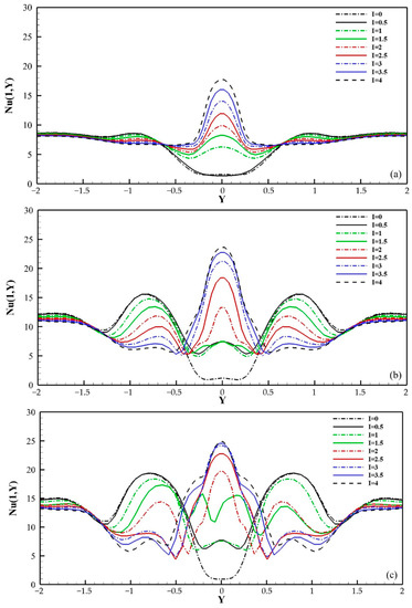 The influence regions of the jet can be more clearly reflected in Figure 6. With the increase in the injection ratio, the values of the local Nusselt number at were also increased regardless of Reynolds number. The local Nusselt number had “double peaks” near and in most cases. However, the values of the “double peaks” decreased with the increase in the injection ratio. As the Reynolds number increased, the local Nusselt number was enhanced, especially at the bilateral peaks. It can be found from Figure 6 that the whole local Nusselt number was symmetrical about , indicating that the jet effect was symmetrical about . As and , the local Nusselt number had four peaks along the Y direction. All in all, the Reynolds number mainly affected the local Nusselt numbers on two sides of the cylinder in the form of the passive control, and the local Nusselt number at the mid-plane () was determined by the active jet. Nevertheless, the heat transfer effect of the active jet interfered with the passive control effect.
