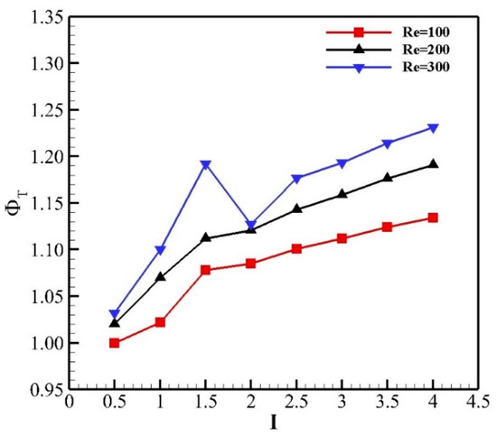 As shown in Figure 7, the thermal efficiency increased with the increase in the injection ratio as . It can be concluded from Figure 7 that the thermal efficiency increased with the increase in the Reynolds number, which was in line with Karthikeyan’s conclusions: the thermal efficiency of active control can be improved by increasing the momentum coefficient of the jet as [30]. The changing trends of thermal efficiencies with injection ratio were the same at , and they exhibited almost linear growth trends. At a low Reynolds number, the thermal efficiency of the microchannel could be improved by increasing the injection ratio. However, considering the additional energy required for active control, it was necessary to select an appropriate injection ratio. However, when and , the thermal efficiency reached a turning point (first increasing and then decreasing), and the growth rate of the thermal efficiency was the largest. At the moment, the interaction between jet and flow over the cylinder greatly increased the heat transfer. This was the same as the above conclusion in Figure 6c. For , the thermal efficiency at was slightly smaller than the thermal efficiencies at I = 3.5 and I = 4.0. Given all of this, it is a more appropriate choice that the injection ratio is taken as 1.5.