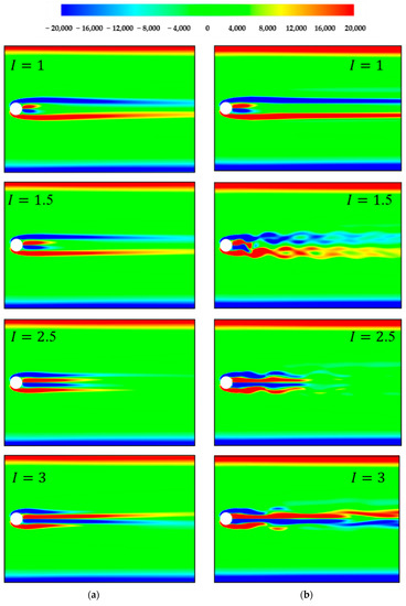 By comparing the heat transfer characteristics of the jet pointing backwards in the cylinder corresponding to different injection ratios (I) and Reynolds numbers, for the same injection ratio, the thermal efficiencies of the microchannel for were better than those for , and the thermal efficiency of the microchannel increased with the injection ratio as . However, the thermal efficiency at did not increase monotonically with the injection ratio. As , the thermal efficiency increased about 20% with respect to and was slightly less than the thermal efficiencies at I = 3.5 and I = 4.0. The injection ratio of was an optimal choice to enhance the heat transfer. This is because the jet with the appropriate injection ratio can induce the flow over the cylinder to become unstable, which disturbs the thermal boundary layer near the wall, so as to improve the heat transfer enhancement.