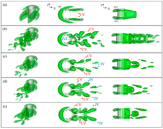 According to the Q criterion [38], the three-dimensional vortex structures corresponding to at are presented in Figure 9a–e, respectively. The horseshoe vortex, which surrounded the cylinder, appeared at the leading edge of two ends of the cylinder due to the upper and lower walls of the microchannel. The horseshoe vortices generated at the intersection of the cylinder and the upper and lower walls are indicated by MV1 and MV2 in Figure 9. The evolution of the vortex structure in the middle part of the cylinder was similar to the two-dimensional flow over the circular cylinder. The reason was that the flow around the finite cylinder with a small aspect ratio was bound by the upper and lower walls [39]. The main vortices shedding from the cylinder and the secondary vortex generated by the jet are denoted by CV and JV in Figure 9, respectively. Without the jet control, the main vortices on both sides of the circular cylinder paralleled with the centerline of the microchannel. It can be seen from Figure 9b–e that there were significant interactions between the main vortices and the jet. At , the main vortex was twisted and became unstable in the flow field due to the jet although the strength of the secondary vortex generated by the jet was low. As the injection ratio increases to 2, the main vortices were suppressed by the secondary vortex generated by the jet, and the strengths of the wake vortices were the lowest in the cases for the jet control. Therefore, the heat transfer effect also declined at this time. As the injection ratio continued to increase, the main vortex was gradually weakened, but the secondary vortex generated by the jet steadily became larger. At the high injection ratio, the main vortex and the secondary vortex tended to coalesce. Thus, the mixing of flow field was also enhanced under the dominant influences of the active jet.