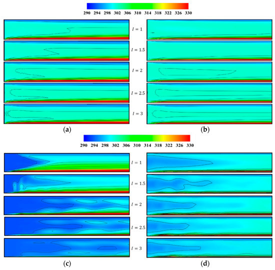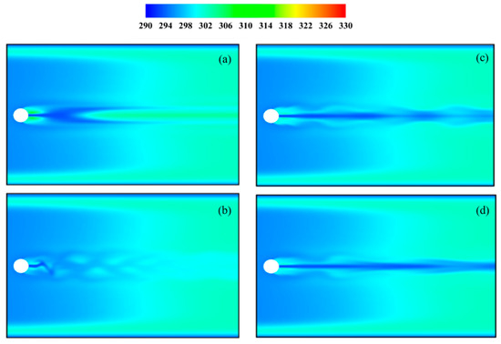 Temperature contours of vertical planes at various Reynolds numbers: (a) Re = 100, and Y = 0.8; (b) Re = 200, and Y = 0.8; (c) Re = 300, and Y = 0; (d) Re = 300, and Y = 0.8.