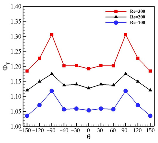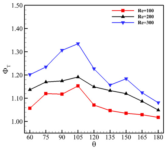 In the range of , the jet angles were selected every 15° in order to obtain the optimal angle for different Reynolds numbers () in Figure 13. Regardless of the Reynolds number, there was a maximum value between . It was found from Figure 13 that when and , the changes of angle had little effect on the thermal efficiency. When , the jet angle had a significant effect on the heat transfer, and the maximum thermal efficiency could be increased to 134%. When , the heat transfer enhancement at was smallest. Combined with energy utilization rate and heat transfer effect, the regulation of the jet angle was superior to the increase in jet velocity in order to improve the thermal efficiency.