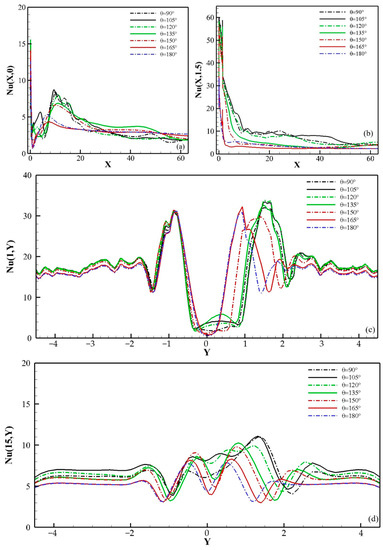 Local Nusselt numbers of different jet angles at (a) Y = 0; (b) Y = 1.5; (c) X = 1; (d) X = 15.