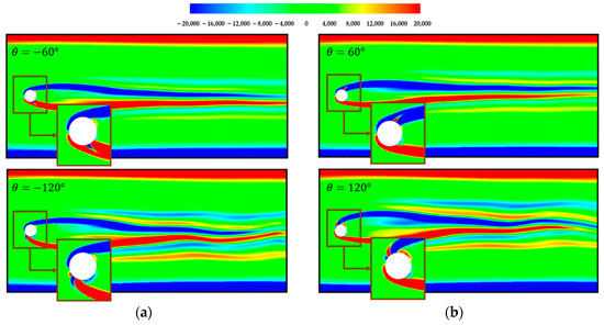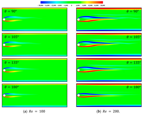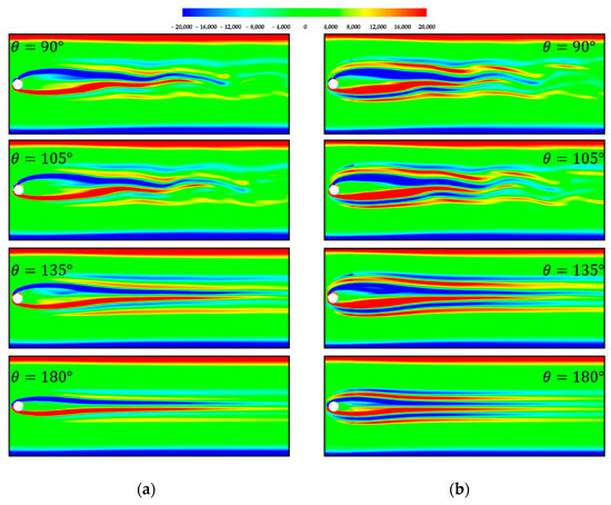 In the following sections, the physical mechanisms of flow and heat transfer corresponding to different jet angles were analyzed from the views of vorticity dynamic and temperature fields point. Figure 15 depicts the vorticity contours for different jet angles at and . At , the strength of wake vortices for different jet angles was not high and stable, and the transverse spacing of vortices shedding from the cylinder for was larger than that for other jet angles, as shown in Figure 15a. As , the strength of wake vortices was enhanced, and the ribbon vortices for became unstable in the far field, as shown in Figure 15b. It was clear that the strength of the wake vortices increased with the Reynolds number, and the distribution range and hydrodynamic instability of wake vortices can be regulated by changing the jet angle. These analyses revealed the reasons that the thermal efficiency of was the lowest, and the heat transfer effect was better at regardless of and in Figure 12 and Figure 13.