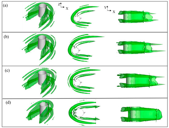 Comparing Figure 17a,b, it was found that the strip vortex structure close to the wall had greater strength. This showed that the three-dimensional characteristics of wake vortices were remarkable. The three-dimensional vortex structure at is shown in Figure 18, where the arrow indicates the jet direction. Compared with Figure 9a, the horseshoe vortex appearing at the junction of the cylinder and walls became larger after changing the jet angle. The horseshoe vortices and the vortices shedding from the central part of cylinder caused the occurrence of wake vortices with multiple strips in Figure 17. From Figure 18a–c, the location of separation points of the main vortex generated on the side with the jet coincided with the jet port at , 105°, 135°. This demonstrates that the jet caused the separation point of flow over the cylinder to move upward. The transverse spacing of the strip vortex in the near field was increased because the oblique jet impinged the horseshoe vortices and the vortices generated on the cylinder. Thus, the distribution characteristics of the wake vortex, which tended to move towards both sides of the cylinder, were altered by using the oblique jet. Finally, the vortices with high transverse spacing in the near field became unstable in the far field, which strengthened the heat transfer.