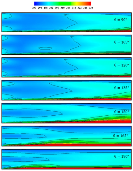 The temperature contours for different jet angles at Y = 1.5 are depicted in Figure 19. The thermal boundary layers downstream of the cylinder were developed along the X direction. The cold and hot fluids in the microchannel can be mixed under the action of the vortices shedding from the cylinder, and the wake vortices were able to hinder the development of the thermal boundary layer. According to the above analysis of vortex dynamic, the transverse spacing of the strip vortex in near field and the instability of wake vortices in far field were changed with the jet angles. From Figure 19, it can be seen that the heat transfer effect was most obvious in the near field because the strength of vortices near the trailing edge of the cylinder was relatively higher for every jet angle. The wake vortices were damped along the X direction due to the diffusion, which led to the development of thermal boundary layer. However, as , the instability of vortex in the far field strengthened the mixing phenomenon of the flow field and slowed down the increase in the thickness of the thermal boundary layer. The depth of the thermal boundary layer corresponding to the jet angle of 105° was the thinnest, indicating that the heat transfer effect was the best. As shown in Table 2, the thermal efficiency for was 1.335, which increased by 20.8 % over the thermal efficiency. For other jet angles, the thickness of thermal boundary layer increased obviously along the downstream due to the quasi-steady wake vortices decaying gradually along the downstream.
