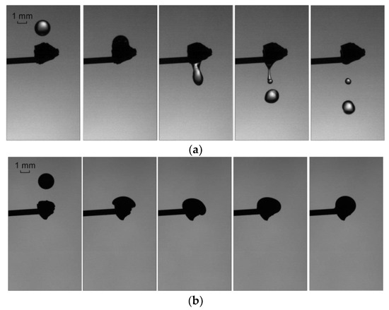 In the experiments, the main patterns of the interaction of liquid droplets with solid particles (being the components of promising composite fuels) were established. Figure 3 and Figure 4 present typical images of the collisions of water and oil droplets of different initial sizes (Rd = 1–2.2 mm) with the carbonaceous particles of coking coal filter cake with Rp = 0.75–1.5 mm (for a series of varying droplet sizes). The images show that the key parameter affecting the occurrence of stretching separation and formation of child droplets at an identical velocity is the particle–droplet size ratio (Δ). Stretching separation proceeded when the kinetic energy of the liquid droplet movement was greater than the sum of energies used to overcome viscous friction, dissipation energy, rotational energy and the energy used to overcome the surface tension forces. If the kinetic energy was greater than the sum of energies, the liquid fragments separated from the solid particle. Otherwise, the liquid droplet remained on the solid particle (agglomeration was recorded). It is clear from Figure 3a,b that at a liquid droplet size Rd of 1.45 mm, stretching separation is bound to occur after the collision with carbonaceous particles with a size Rp of 0.75–0.9 mm. The collisions of such droplets with dry particles resulted in the formation of several child droplets. With a reduction in the initial droplet size Rd to 1.1 mm (Figure 3a,b), agglomeration was recorded. Here the droplet stuck to the carbonaceous particle and enveloped it. The liquid layer was not detached. Agglomeration occurred irrespective of whether the particle surface was dry or wet. Agglomeration was recorded both for dry and wetted particles. This result is extremely important for the technologies of composite fuel droplet preparation, since coals have different moisture content, and particles can be wetted using different methods.