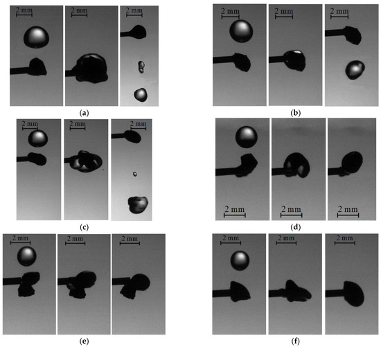 The experiments [35,50] also showed that the droplet–particle size ratio has a decisive effect on the collision regime. An assumption was made that the size of a droplet has a significant effect on the outcomes of its interaction with a particle at a constant ratio of their sizes. With an increase in the droplet volume, the ratio of surface tension to inertia decreases. Figure 5 presents typical images of the collisions of distilled water droplets with anthracite particles when varying Rd. The main parameter affecting the occurrence of stretching separation and child droplet formation at a constant velocity is the size of the initial droplets. Agglomeration, however, was recorded during the collisions between water droplets and anthracite particles at a droplet radius Rd of 1.3 mm or smaller.