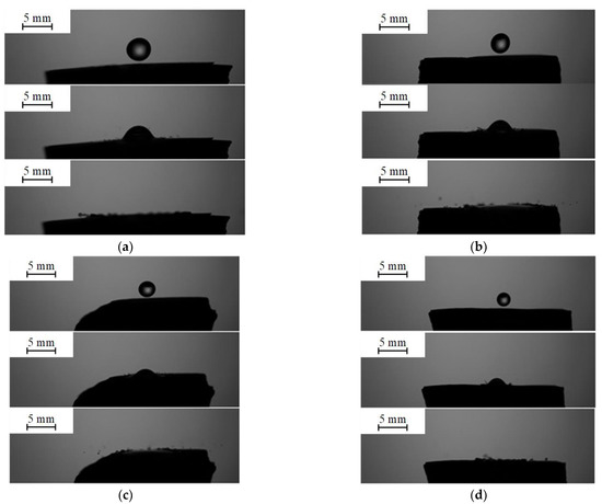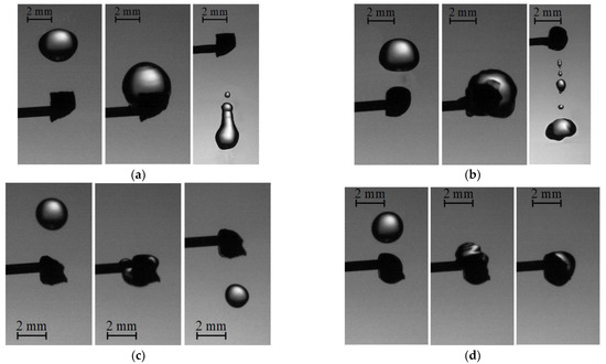 Images of collisions of distilled water droplets with substrates in the form of monolithic anthracite fragments at varying droplet sizes, Ud = 2.6 m/s: (a)—droplet Rd = 2 mm; (b)—droplet Rd = 1.6 mm; (c)—droplet Rd = 1.3 mm; (d)—droplet Rd = 1.1 mm.