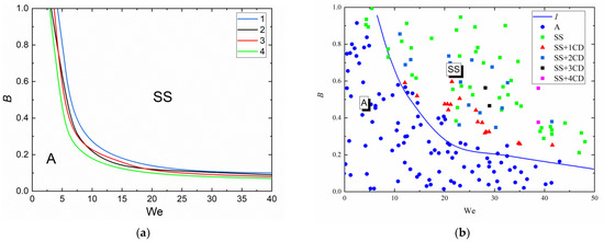 Interaction regime maps (a) for distilled water droplets colliding with carbonaceous particles of coals of different ranks at Δ = 1, Rd = Rp = 1.1–1.2 mm, (b) water droplets colliding with solid particles (approx. 3 mm in diameter) [35]: 1—filter cake of coking coal; 2—brown coal; 3—coking coal; 4—anthracite. A—agglomeration; SS—stretching separation; CD—child droplets.