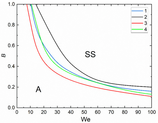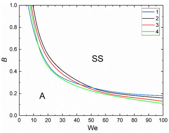 Interaction regime maps for used motor oil droplets colliding with carbonaceous particles of coals of different ranks at Δ = 1, Rd = Rp = 1.1–1.2 mm: 1—filter cake of coking coal; 2—brown coal; 3—coking coal; 4—anthracite. A—agglomeration; SS—stretching separation.