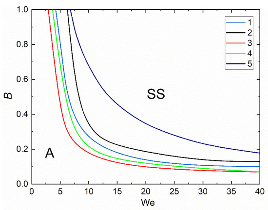 Interaction regime maps of distilled water droplets colliding with carbonaceous particles of coals of different ranks at Δ = 1, Rd = Rp = 1.1–1.2 mm: 1—dry particle of coking coal filter cake; 2—wetted particle of coking coal filter cake; 3—dry particle of anthracite; 4—wetted particle of anthracite; 5—data of Pawar et al. [35]. A—agglomeration; SS—stretching separation.