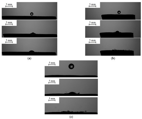 Images of collisions of distilled water droplets with substrates in the form of monolithic anthracite fragments at varying droplet impact velocities, Rd = 1.1 mm: (a)—droplet at Ud = 0.9 m/s (We = 30); (b)—droplet at Ud = 2.6 m/s (We = 200); (c)—droplet at Ud = 3.3 m/s (We = 300).