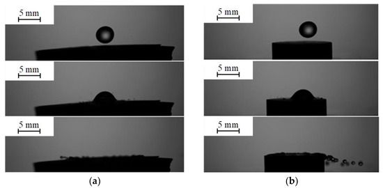 Images of collisions of distilled water droplets with substrates of anthracite when varying the substrate type, Rd = 2 mm, Ud = 2.6 m/s: (a)—monolithic fragment; (b)—pressed pellet.