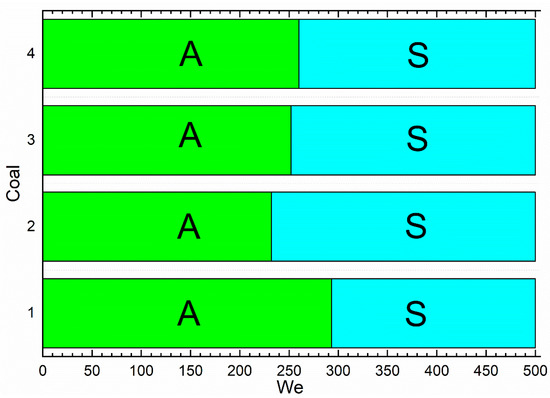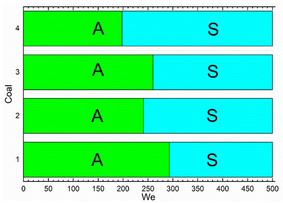 Interaction regime maps for distilled water droplets colliding with carbonaceous substrates when varying coal rank and substrate, Rd = 1.4 mm: 1—pressed pellet from filter cake of coking coal; 2—monolithic fragment of filter cake of coking coal; 3—pressed pellet from anthracite; 4—monolithic fragment of anthracite. A—agglomeration; S—separation.