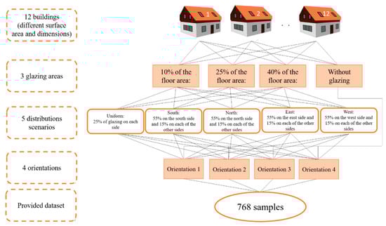 The present research evaluated a dataset found in the study carried out by Tsanas and Xifara [] and utilized in Duarte et al. []. The dataset is collected through the simulation of a number of buildings via Ecotec software, which is an analytical package used for environmental purposes and fully compatible with general building information modeling software packages, like Autodesk Revit Architecture. Ecotec carried out a complex preliminary analysis of the performance and energy demand of the building with an interactive, highly visual interface and a wide selection of analytical functions that provide the user with the capability of presenting the acquired data directly within the model context. The dataset is composed of eight input variables and one output variable, presented in Table 1. On the basis of a model of an elementary cube (3.5 m × 3.5m × 3.5 m), a modular geometric system is obtained.