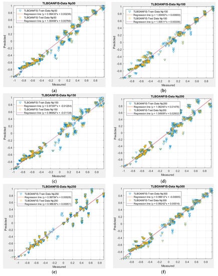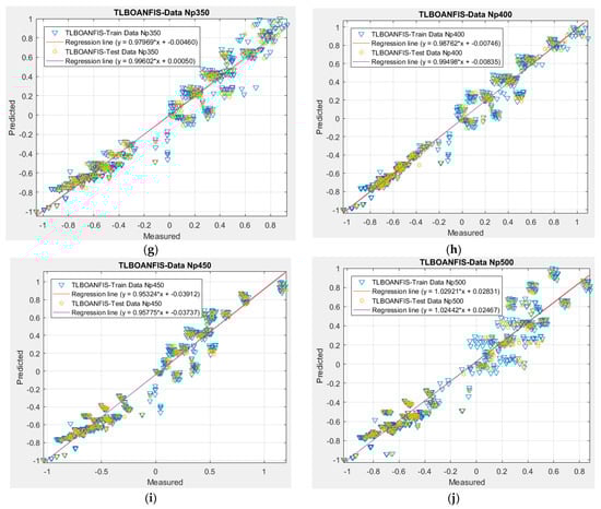 The accuracy performance of testing and training dataset for TLBO–ANFIS. (a) TLBO–ANFIS Np = 50; (b) TLBO–ANFIS Np = 100; (c) TLBO–ANFIS Np = 150; (d) TLBO–ANFIS Np = 200; (e) TLBO–ANFIS Np = 250; (f) TLBO–ANFIS Np = 300; (g) TLBO–ANFIS Np = 350; (h) TLBO–ANFIS Np = 400; (i) TLBO–ANFIS Np = 450; (j) TLBO–ANFIS Np = 500.