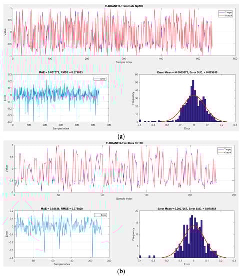 Error value and Frequency in TLBO–ANFIS-100 best fit structure. (a) Training dataset; (b) Testing dataset.