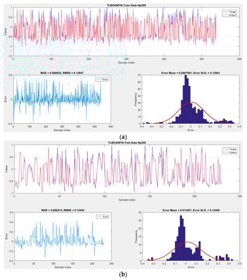 Error value and Frequency in TLBO–ANFIS-200 best fit structure. (a) Training dataset; (b) Testing dataset.